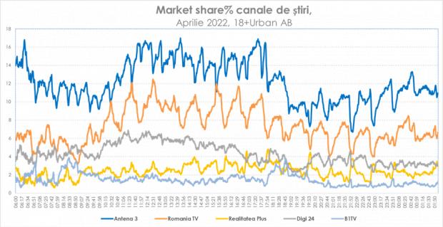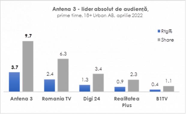 În luna aprilie Antena 3 a înregistrat creșteri semnificative ale indicatorilor de audiență. Astfel, comparativ cu luna aprilie 2021, postul și-a consolidat puternic audiența pe cele mai importante intervale orare. La nivelul întregii țări, peste 10 milioane de telespectatori unici au ales Antena 3 ca sursă de informare, postul nostru fiind lider pe cele mai importante categorii de public.