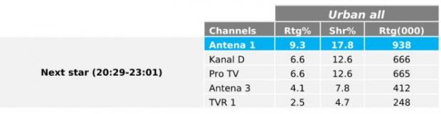 Astfel, Next Star a fost urmărit aseară în medie de peste 938 000 de telespectatori la nivelurban, înregistrând un rating mediu de 9.3% şi 17.8% cotã de piaţã, cu mult peste celelalte posturi concurente. Locurile doi şi trei au fost ocupate de Kanal D şi, respectiv, Pro TV, care au înregistrat în intervalul 20:29-23:01 doar 6.6% rating şi 12.6% cotă de piaţă. In intervalul comun de difuzare, Next Star a spulberat şi ultima semifinală Eurovision, difuzată la TVR 1, care a ocupat abia cea de-a cincea poziţie în topul audienţelor.