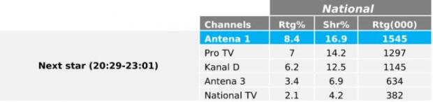 Ierarhia s-a păstrat şi pe segmentul naţional, Next Star fiind preferatul românilor, cu 8.4% rating şi 16.9% cotă de piaţă. Pro TV a ocupat poziţia secundă, cu 7% rating şi 14.2% share, în vreme ce Kanal D atingea atunci doar 6.2% rating şi 12.5% share.