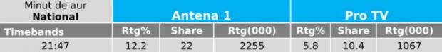În minutul de aur, 21:47, Next Star a adus în faţa micilor ecrane peste 2 255 000 de telespectatori la nivel naţional, peste dublu faţă de cei care urmăreau atunci programul oferit de Pro TV.