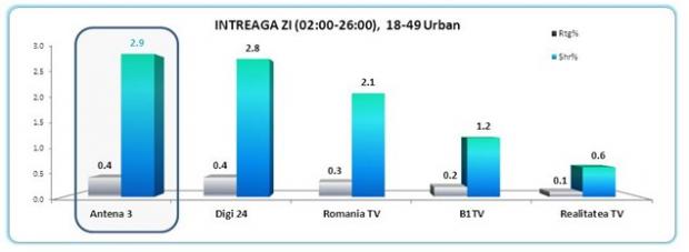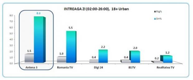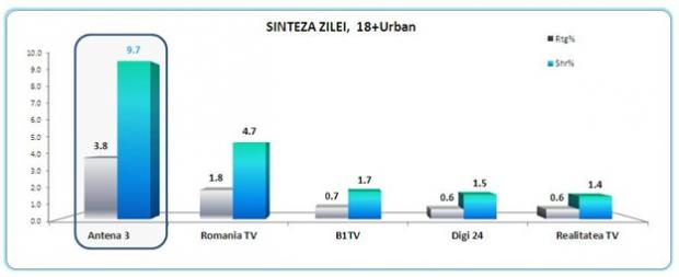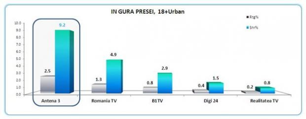 Cele mai urmarite programe ale zilei au fost Sinteza Zilei cu Mihai Gadea si In gura presei cu Mircea Badea, atat pe targetul 18+ urban, cat si pe cel comercial. Astfel, Sinteza Zilei a obtinut 9.7% market share pe targetul18+urban si 3% cota de piata pe targetul 18-49, in timp ce one-man-showul lui Mircea Badea a inregistrat medii de 9.2%, respectiv 4.4% cota de piata.