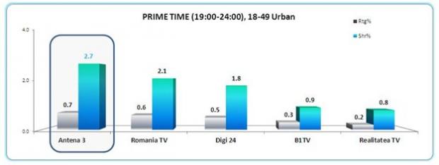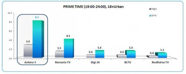 Postul nostru de stiri si-a pastrat pozitia intai si in prime time, unde a obtinut cifre chiar mai mari decat in timpul zilei, inregistrand medii de 8.5% cota de piata pe 18+ urban si 2.7% pe targetul comercial.