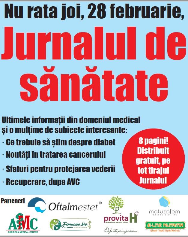 Jurnalul îţi oferă gratuit, joi, 28 februarie, Jurnalul de sănătate, un ghid cu informaţii de ultimă oră din domeniul medical. Suplimentul de opt pagini este distribuit gratuit, pe tot tirajul Jurnalului.