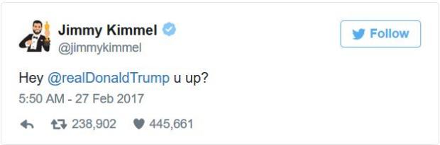 Pe langa glumele sale live, Kimmel i-a trimis un mesaj pe Twitter lui Donald Trump, președintele SUA. In doar 4 minute, mesajul trimis de Jimmy Kimmel a adunat 160.000 de like-uri și peste 110.000 de retweet-uri!