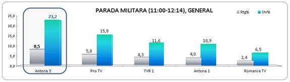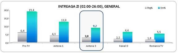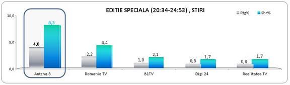 Programul Antena 3 a obţinut o medie de 4% rating şi 8,3% cotă de piaţă, o audienţă aproape dublă faţă de următorul competitor clasat.