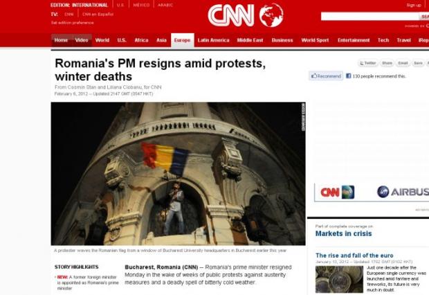Intens comentată în presa străină a fost şi demisia lui Emil Boc. CNN, care a preluat imaginile transmise de Antena 3, a acordat mare atenţie în jurnalele sale situaţiei din România.