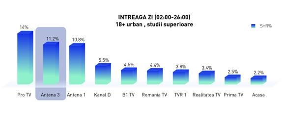 O cercetare a profilului publicului Antena 3, în perioada 1 ianuarie – 20 noiembrie 2014, la nivelul întregii zile, pe targetul 18+ urban, situează Antena 3 pe locul al doilea în clasament, după Pro TV, cu o medie de 11,2% cotă de piaţă.