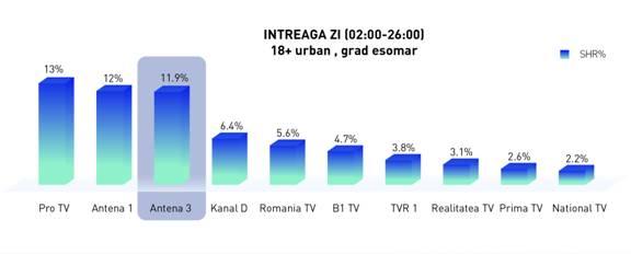 În clasamentul celor mai puternice televiziuni cu public premium (grad esomar AB), Antena 3 ocupă locul al treilea, după generalistele Pro TV şi Antena 1, cu o medie de 11,9% share.