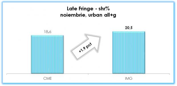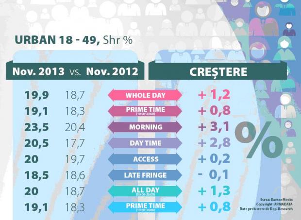 Comparativ cu luna precedentă a anului 2013, “Antenele” și-au consolidat poziția de lider în audiențe, în rândul publicului din întreg mediul urban. “Mireasă pentru fiul meu”, reality prezentat de Mirela Boureanu Vaida, a fost și în luna noiembrie lider de audiență într-o majoritatea covârșitoare a edițiilor. Producțiile marca Observator au contribuit de asemenea la înregistrarea unei cote de piață de 23,2%, cu nouă puncte de market share mai mult decât trustul concurent.