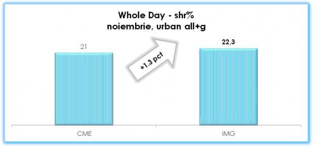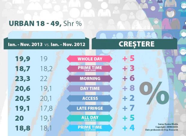 Creșteri pe toate intervalele orare s-au înregistrat și în rândul publicului din întreg mediul urban, unde posturile Grupului Intact dețin supremația în Whole Day, Day Time, Access și Late Fringe. Față de anul trecut, Antena1 a câștigat 27.000 telespectatori .