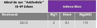 Vârful de audienţă al staţiei a fost atins la ora 23.13, în timpul reality-show-ului “Asistentele”, atunci când Antena Stars a atins un rating de 2,0% şi 5,1% market share, reprezentând 110.000 de telespectatori care le urmăreau pe două asistente sexy, Ana şi Loredana, aflate la Verona.