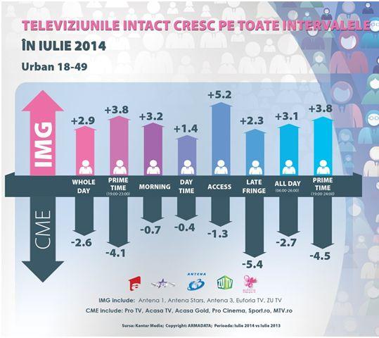 În rândul publicului din întreg mediul urban, IMG este lider categoric de audiență în Prime-Time, Whole Day, Day Time, Access, Late Fringe. Creșterile cotei de piață de mai jos sunt expuse comparativ cu luna iulie a anului trecut.
