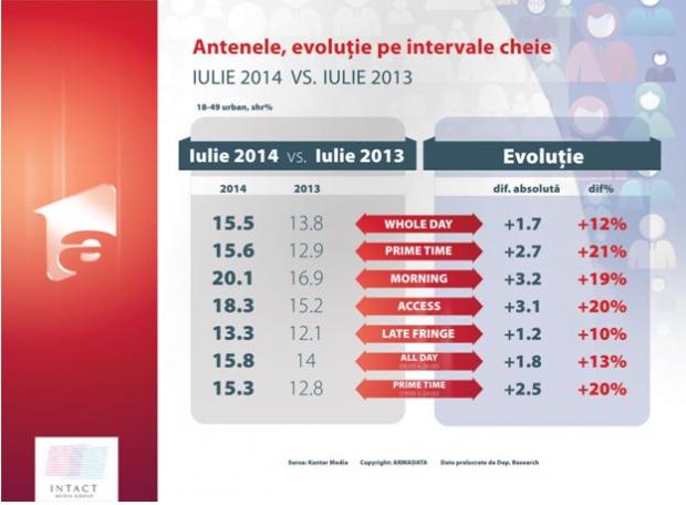 Televiziunile Intact conduc clasamentul audiențelor, în rândul publicului comercial (cu vârste cuprinse între 18 și 49 de ani), după cum urmează, comparativ cu luna iulie 2013.