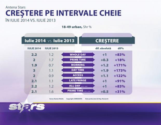 Antena Stars este postul cu cele mai importante creșteri de audiență din peisajul media autohton. Aprecierile se înregistrează pe toate intervalele orare, pe segmentul publicului comercial. Telespectatorii pot urmări în direct, la această televiziune, atât buletine de știri, cât și talk-show-uri, unde sunt invitate cele mai în vogă personaje mondene. Campania de vară aflată sub sloganul “Toate fițele sus” se bucură de susținerea, la nivel interactiv, a concursului cu “selfițe” (”selfie-uri la mare fiță”), în care un număr record de telespectatori și-au trimis propriile poze din vacanțele în care au fost.