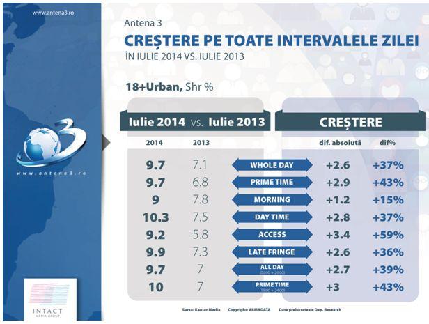 Un alt aspect important de remarcat este că audiențele “Antenelor” sunt în creștere pe intervalele orare și pe targeturile importante (All Urban și 18- 49, Urban), în timp ce televiziunile trustului concurent CME înregistrează scăderi pe toate segmentele orare, pe ambele target-uri menționate, comparativ cu luna iulie a anului trecut.