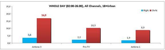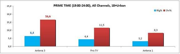 Şi seara, în prime time, cu o medie de 16,6% share şi 6,4% rating, Antena 3 şi-a păstrat poziţia de lider.