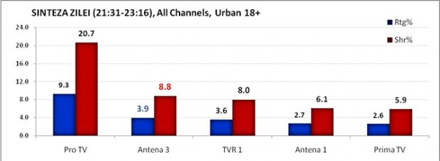 Varful de audienta a fost inregistrat la ora 21:53, cand Antena 3 a atins 5.7% rating și 11.6% market share, fiind urmarita de 588.000 de telespectatori in timp ce se difuza Sinteza Zilei cu Mihai Gadea. Editia speciala a emisiunii, unde au fost invitati Victor Ponta, in prima parte, si Nana Mouskouri in cea de-a doua, a fost, de altfel, al doilea cel mai urmarit program de pe piata din intervalul orar de difuzare, fiind depasit doar de Pro Tv. Cu o medie de 3.9 puncte audienta si 8.8% cota de piata, Sinteza Zilei s-a detasat de toate celelalte productii ale televiziunilor informative.