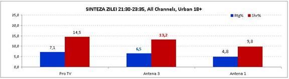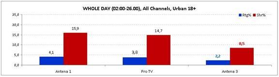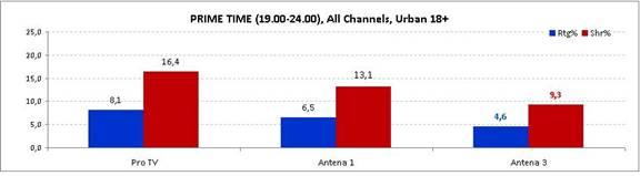 Seara, în prime time, Antena 3 a înregistrat o medie de 4,6% rating şi 9,3% cotă de piaţă, păstrându-şi poziţia a treia în clasamentul general şi adjudecându-şi statutul de lider în topul posturilor de ştiri, la o diferenţă considerabilă faţă de următorul competitor direct clasat.