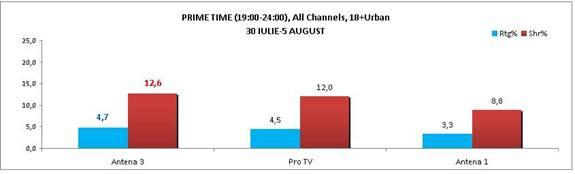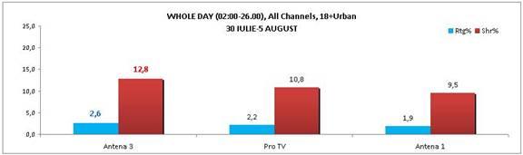 În săptămâna 30 iulie – 5 august, la nivelul întregii zile, Antena 3 s-a impus ca cea mai urmărită televiziune din România în rândul publicului din mediul urban cu vârstă de peste 18 ani, înregistrând o medie de 12,8% cotă de piaţă şi 2,6% rating.
