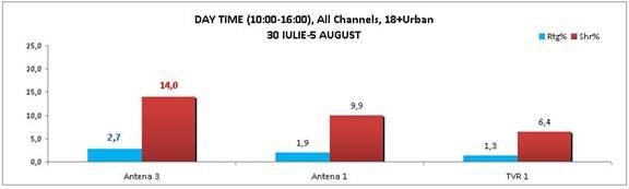 Loc fruntaş a ocupat şi în day time, intervalul orar 10.00 – 16.00, postul de ştiri atingând o medie de 14% cotă de piaţă şi 2,7% rating.