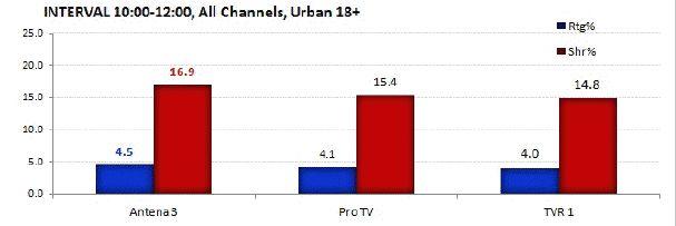 La nivelul intregii zile, Antena 3 a ocupat locul intai in clasamentul televiziunilor informative, cu o medie de 2.5% rating si 8.4% cota de piata, si pozitia a treia in clasamentul general, dupa Pro tv si Antena 1. Aceeasi ierarhie s-a pastrat si in prime time, unde postul de stiri a tinut aproape de cele doua puternice canale generaliste, cu o medie de 3.1% rating si 6% market share.