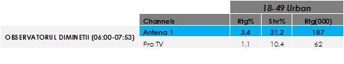 Dimineaţa a început în forţă la Antena 1, Observatorul dimineţii şi cele două producţii cinematografice, „Pistruiatul” şi „Beethoven 3” impunându-se ca lider detaşat de audienţă, atât la nivelul targetului comercial 18-49 urban, cât şi la nivel urban şi naţional. Românii au urmărit în număr foarte mare primul buletin de ştiri al anului la Antena 1, Observatorul dimineţii adjudecându-şi prima poziţie în topul audienţelor, cu un rating mediu de 3.4% şi 31.2% cotă de piaţă cifre de trei ori mai mari faţă de cele înregistrate de Pro Tv, pe acelaşi interval orar şi la nivelul aceluiaşi target, 18-49 urban.