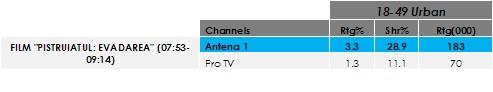 Filmul românesc de aventuri, semnat Sergiu Nicolaescu a fost şi el preferatul românilor, „Pistruiatul: Evadarea” ocupând prima poziţie în clasamentul audienţelor, atât pe targetul comercial, cât şi la nivel urban şi naţional. Cu un rating mediu de 3.3% şi 28.9% cotă de piaţă, pelicula românească a spulberat programul oferit atunci de Pro Tv, ce înregistra doar 1.3% rating şi 11.1% cotă de piaţă.