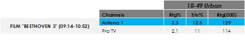 Ziua a continuat în forţă cu aventurile celebrului câine vorbitor, Beethoven, filmul „Beethoven 3”, impunându-se şi el ca lider detaşat de audienţă, la nivelul tuturor targeturilor relevante, cu un rating mediu de 2.3% şi 12.5% cotă de piaţă, înregistrate pe targetul comercial, 18-49 urban.