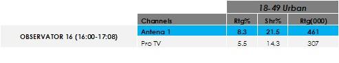 Observatorul orei 16 şi-a adjudecat şi el prima poziţie în clasamentul audienţelor, buletinul de ştiri înregistrând un rating mediu de 8.3% şi o cotă de piaţă de 21.5% şi clasând totodată principalul competitor, Pro Tv, pe poziţia secundă, cu doar 5.5% rating şi 14.3% cotă de piaţă.