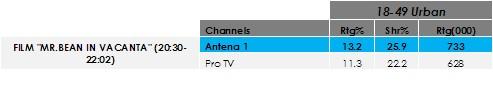 Românii au ales să îşi încheie ziua tot în compania Antenei 1, alături de comedia spumoasă „Mr. Bean în vacanţă”, ce s-a impus şi ea ca lider detaşat de audienţă, la nivelul tuturor categoriilor relevante de public. Cu un rating mediu de 13.2% şi 25.9% cotă de piaţă, producţia cinematografică a surclasat aseară orice concurenţă.