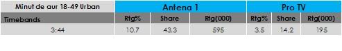 În minutul de aur, înregistrat la 3:44, Antena 1 înregistra cifre de trei ori mai mari decât principalul competitor, Pro Tv, pe targetul comercial, 18-49 urban, atingând un rating de 10.7% şi o cotă de piaţă de 43.3%, faţă de doar 3.5% şi respectiv 14.2%, cât înregistra atunci programul oferit de Pro TV.