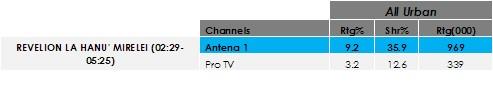 Ierarhia s-a păstrat şi la nivel urban şi naţional, peste 969 000 de telespectatori urmărind, în medie, programul “Revelion la Hanul Mirelei”, în vreme ce doar 339 000 de telespectatori urmăreau programul oferit de principalul competitor, Pro Tv, în acelaşi interval orar. Astfel, cu un rating mediu de 9.2% şi 35.9% cotă de piaţă, şi la nivel urban, Antena 1 a înregistrat cifre aproape triple faţă de Pro Tv.