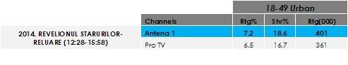 Şi în reluare, programul de Revelion prezentat de Dan Negru s-a impus ca lider detaşat de audienţă, la nivelul tuturor categoriilor relevante de public, Astfel, reluarea „2014, Revelionul Starurilor” a înregistrat ieri, pe targetul comercial, 18-49 urban, un rating mediu de 7.2% şi 18.6% cotă de piaţă, clasând programul oferit de principalul competitor, Pro Tv, pe poziţia secundă. Peste 1 434 000 de telespectatori la nivel naţional au urmărit ieri, în medie, reluarea programului de Revelion prezentat de campionul divertismentului, Dan Negru.