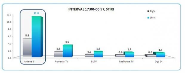 Solidaritatea romanilor cu abuzul impotriva Antena 3 s-a simtit si in audiente. Incepand cu ora 17, cand Antena 3 a anuntat in direct ordinul de evacuare urgenta primit de la ANAF, postul de stiri al INTACT Media Group a condus timp de 8 ore clasamentul televiziunilor de stiri din Romania, cu cifre triple fata de urmatorul post din ierarhie, inregistrand o medie de 5.4 puncte de audienta si 11.8% market share.