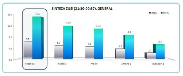 Varful de audienta a fost inregistrat in minutul 22:29, cand Antena 3 a atins 10.2% rating și 18.9% market share fiind market lider.