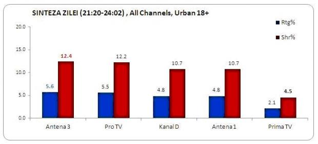 Cu o medie de 5.6 puncte audienta si 12.4% cota de piata, Sinteza Zilei realizata de Mihai Gadea a depasit toate celelalte televiziuni din Romania pe intervalul orar aferent emisiunii, 21:20-00:02.