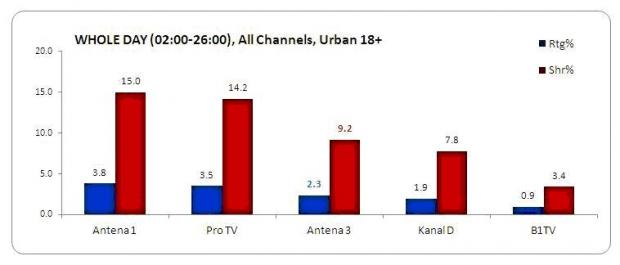 La nivelul intregii zile, Antena 3 si-a pastrat pozitia de lider inrformativ si s-a distantat de celelalte posturi de stiri cu o medie de 9.2% cota de piata, clasandu-se pe locul 3, dupa Antena 1 si Pro tv.