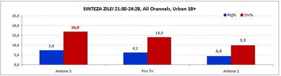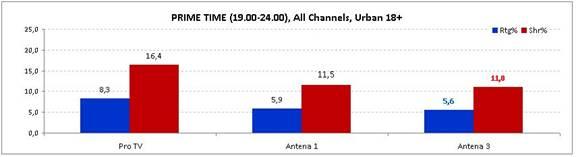 Clasamentul a rămas acelaşi şi în prime time, când postul de ştiri a adunat nu mai puţin de 5,6 puncte de rating şi 11 puncte de share, detaşându-se considerabil faţă de următorul competitor direct.