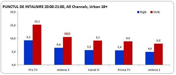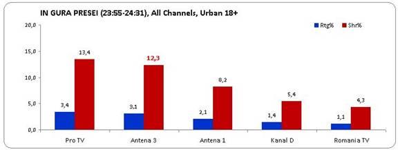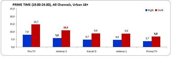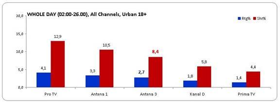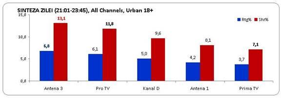 În cel mai dificil interval orar, 19-24, Antena 3 a reuşit o performanţă chiar mai bună şi s-a clasat pe locul al doilea în piaţă, după Pro TV, înregistrând o medie de 5,8% rating şi 10,9% cotă de piaţă.