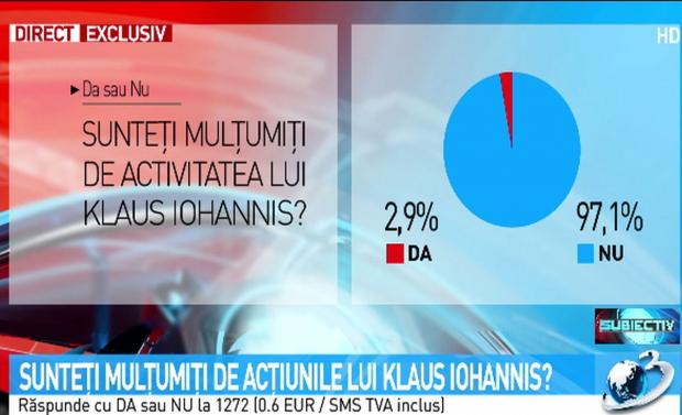 UPDATE: Rezultatul sondajului a fost unul uimitor. 97,1%, dintre telespectatorii Antena 3 care au votat prin SMS la 1272 sunt nemulţumiţi de acţiunile lui Klaus Iohannis.