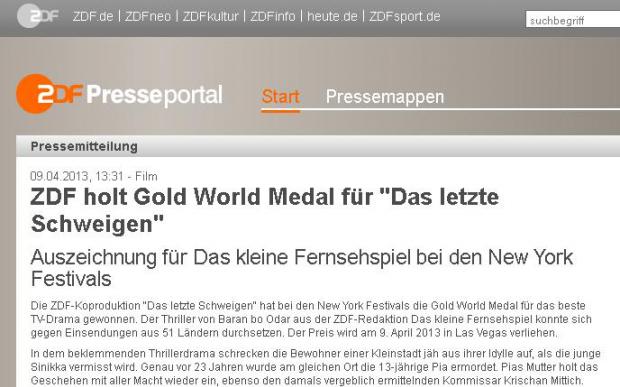 "The Silence " a fost producţia care le-a adus nemţilor de la ZDF Medalia World Gold la New York Film Festivals pentru cea mai buna drama TV .