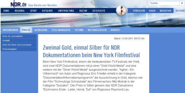 La Festivalul de Film de la New York , unul dintre cele mai importante festivaluri de televiziune din lume, din partea televiziunii NDR au participat două documentare, fiecare primind premiul "World Gold Medal", iar un al treilea documentar a fost recompensat cu "World Silver Medal".