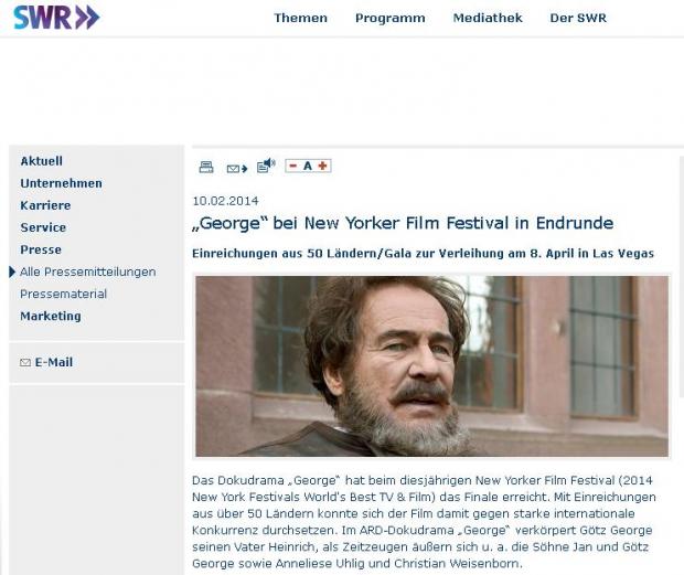 "George" spune povestea unui bărbat care trece prin drame existenţiale în Germania nazistă. Imaginile istorice, interviurile cu personajele vremii şi cadrele din vremea războiului au impresionat membrii juriului care au oferit Medalia de Aur acestui documentar dramă.