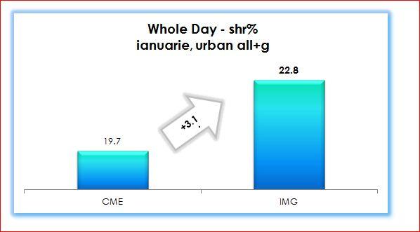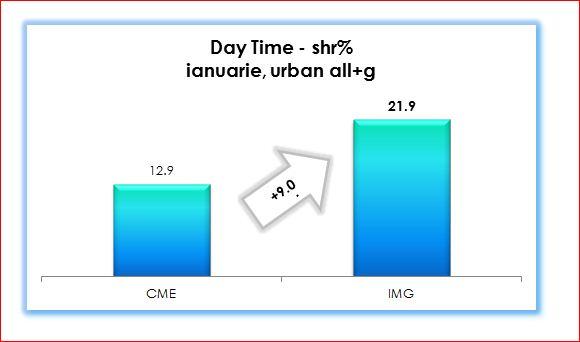 O diferenţă uriaşă de audienţă este înregistrată în Day Time, unde televiziunile Intact Media Group sunt pe primul loc, având o medie a cotei de piață pe luna ianuarie cu 9 puncte mai mare comparativ cu CME.