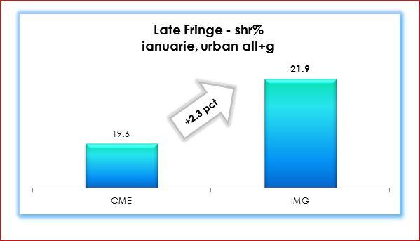 Late Fringe (23,00 - 02,00) este un alt interval orar în care posturile IMG sunt pe primul loc în topul audienţelor în funcţie de cota de piaţă înregistrată în ianuarie. Pe locul al doilea se situează CME, la 2,3 puncte diferenţă.