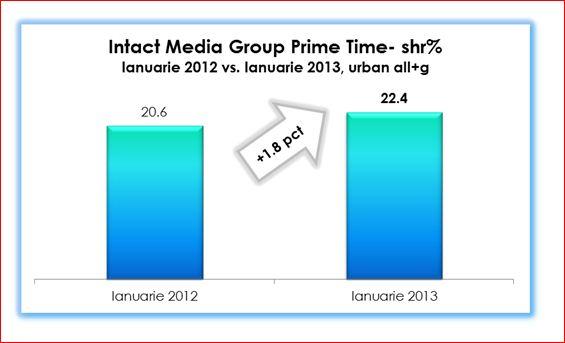 Televiziunile Intact au avut, de asemenea, o creştere consistentă a mediei cotei de piaţă în Prime Time în ianuarie 2013, comparativ cu aceeaşi luna a anului trecut.