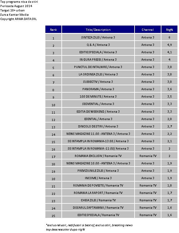În clasamentul celor mai urmărite emisiuni difuzate de posturile de ştiri, Antena 3 a condus detaşat prin numărul de poziţii ocupat, „Sinteza zilei cu Mihai Gâdea”, „Q&A cu Alessandra Stoicescu”, „Ediţie specială”, „În gura presei cu Mircea Badea” şi „Punctul de întâlnire cu Radu Tudor” alcătuind top 5 programe cu cel mai mare rating.