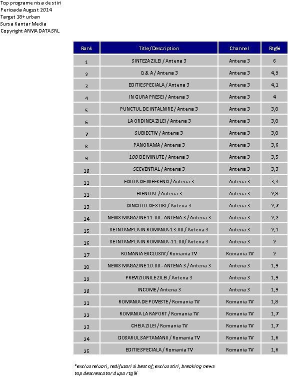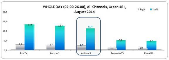 La nivelul întregii zile, Antena 3 a înregistrat o medie de 2,5 % rating şi 11,4% cotă de piaţă, şi o creştere a ratingului de 79% faţă de august 2013, fiind lider pe segmentul de ştiri şi pe locul al treilea în piaţă.