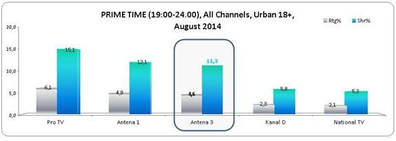 În prime time, când la Antena 3 s-au urmărit emisiunile „La ordinea zilei cu Dana Grecu şi Radu Tudor”, „Subiectiv cu Răzvan Dumitrescu”, „Sinteza zilei cu Mihai Gâdea”, „În gura presei cu Mircea Badea”, dar şi „Dincolo de ştiri cu Cristina Ţopescu”, „Q&A cu Alessandra Stoicescu”, „Panorama cu Oana Stănciulescu”, „Punctul de întâlnire cu Radu Tudor” (în weekend), postul nostru de ştiri a obţinut o medie de 4,6% rating şi 11,3% share, având o audienţă dublă faţă de luna august a anului trecut.
