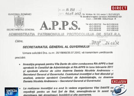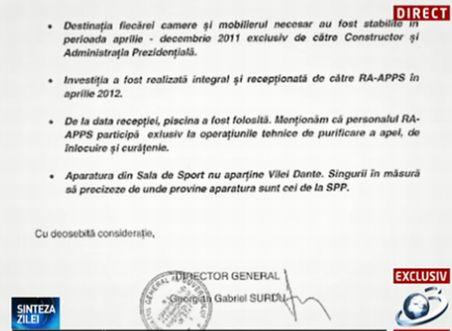 Conducerea Regiei Patrimoniului Protocolului de Stat (RA-APPS) a transmis Guvernului o adresă privind Vila Dante, în care susţine că destinaţia fiecărei camere şi mobilierul necesar au fost stabilite, în perioada aprilie-decembrie 2011, "exclusiv de către constructor şi Administraţia Prezidenţială".